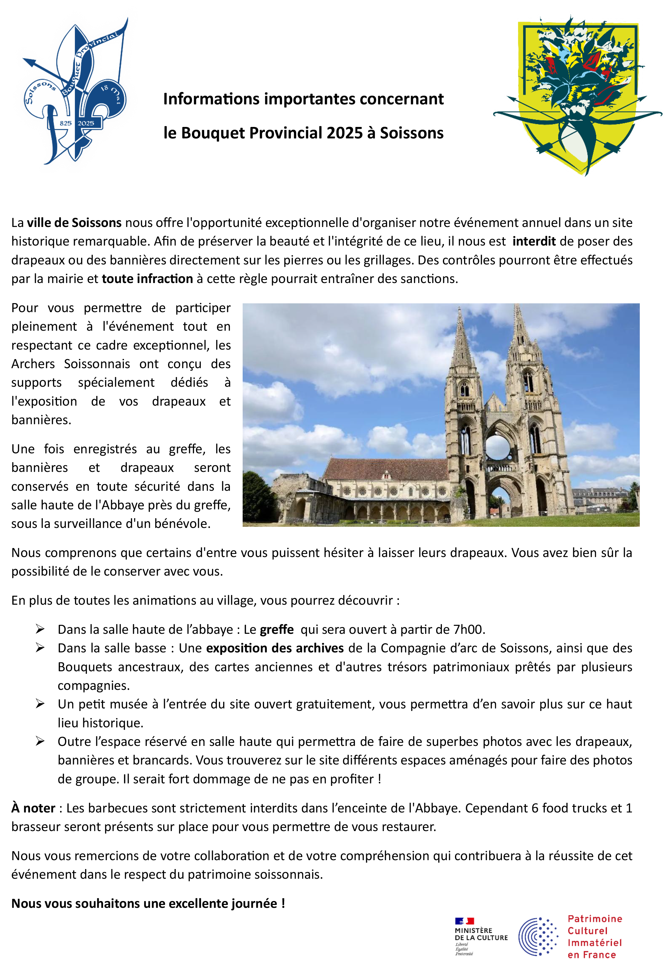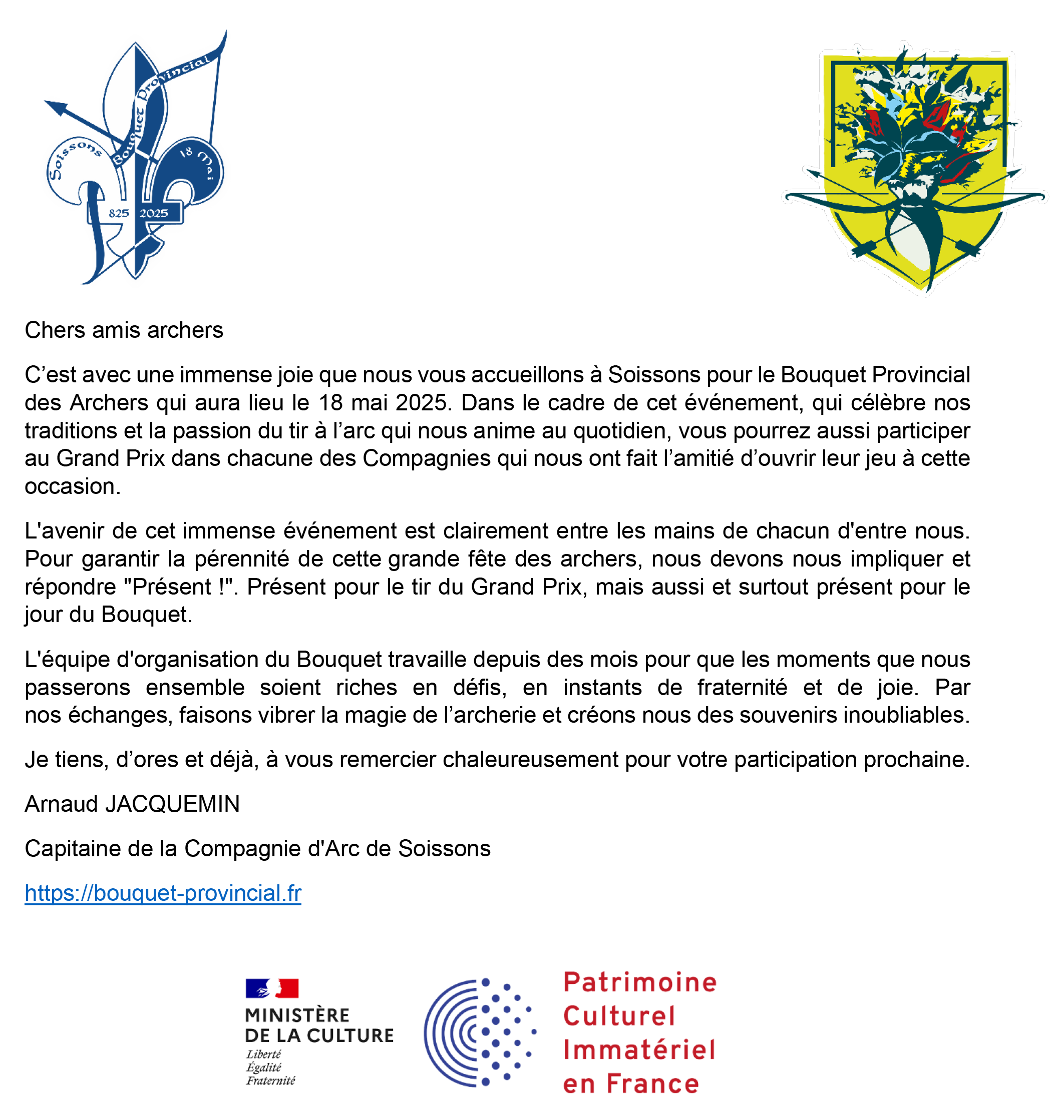 Vous avez sans doute remarqué que le logo du patrimoine culturel français est présent sur tous nos documents du Bouquet Provincial, il témoigne de notre engagement à promouvoir et à préserver nos traditions, notamment celles liées à toutes les disciplines du Beursault (Prix Généraux, Prix Particuliers, Bouquet Provincial, tirs qualificatifs, Championnat de France etc…) ce logo joue un rôle essentiel dans la valorisation et la communication autour de notre patrimoine du « Noble Jeu de l’Arc ». Grâce à son utilisation croissante et accrue, nous espérons que le ministère de la culture remarquera nos initiatives pour contribuer à la transmission de notre précieux héritage. Nous sommes tous responsables de la promotion et de la mise en valeur de nos traditions d'archerie. ![]() | ||||