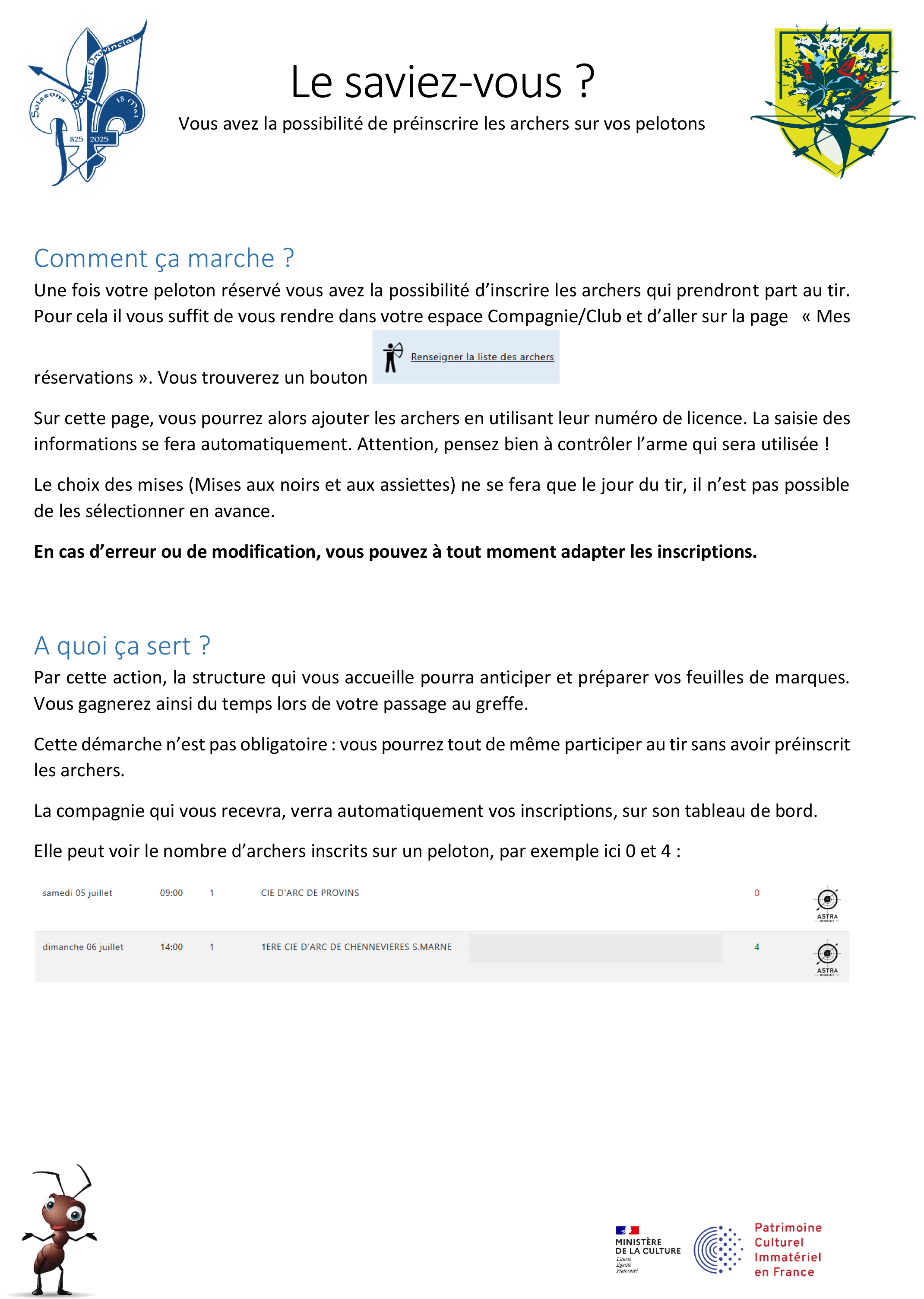 Le saviez-vous ?Afin de faciliter votre passage au greffe le jour de votre tir, vous pouvez à l'avance inscrire la liste des archers qui prendront part au peloton Voir le fichier en PDF | ||||