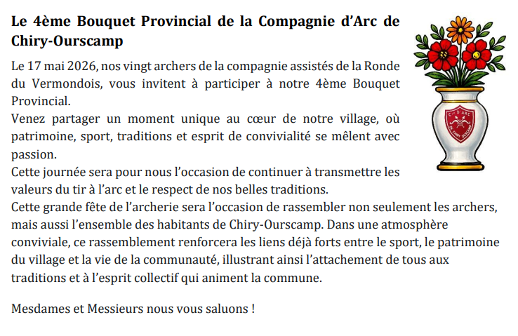 La Compagnie d'arc de Chiry Ourscamp a l'honneur de vous convier au Bouquet Provincial